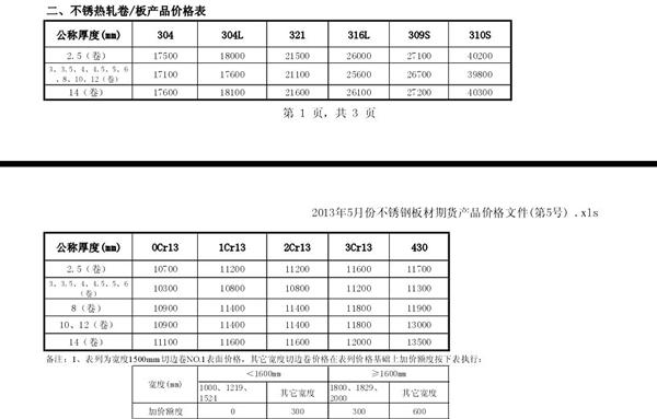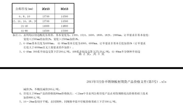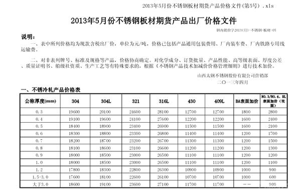 太钢不锈2013年5月份不锈钢板材期货产品出厂价格
