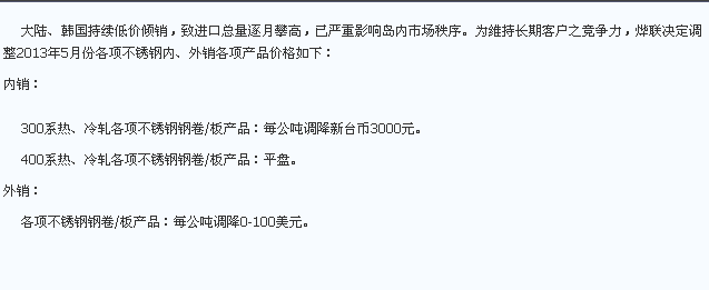 台湾烨联2013年5月份不锈钢出厂价调整情况